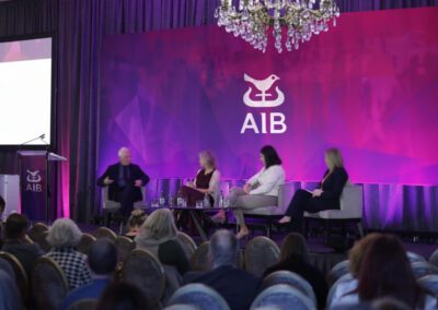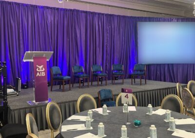 Branded SignageCustom branded signage was incorporated in the space to reinforce AIB’s identity. Strategic placement ensured that branding remained visible without overpowering the stage or presentation content and would be captured in any images of the event on social media.