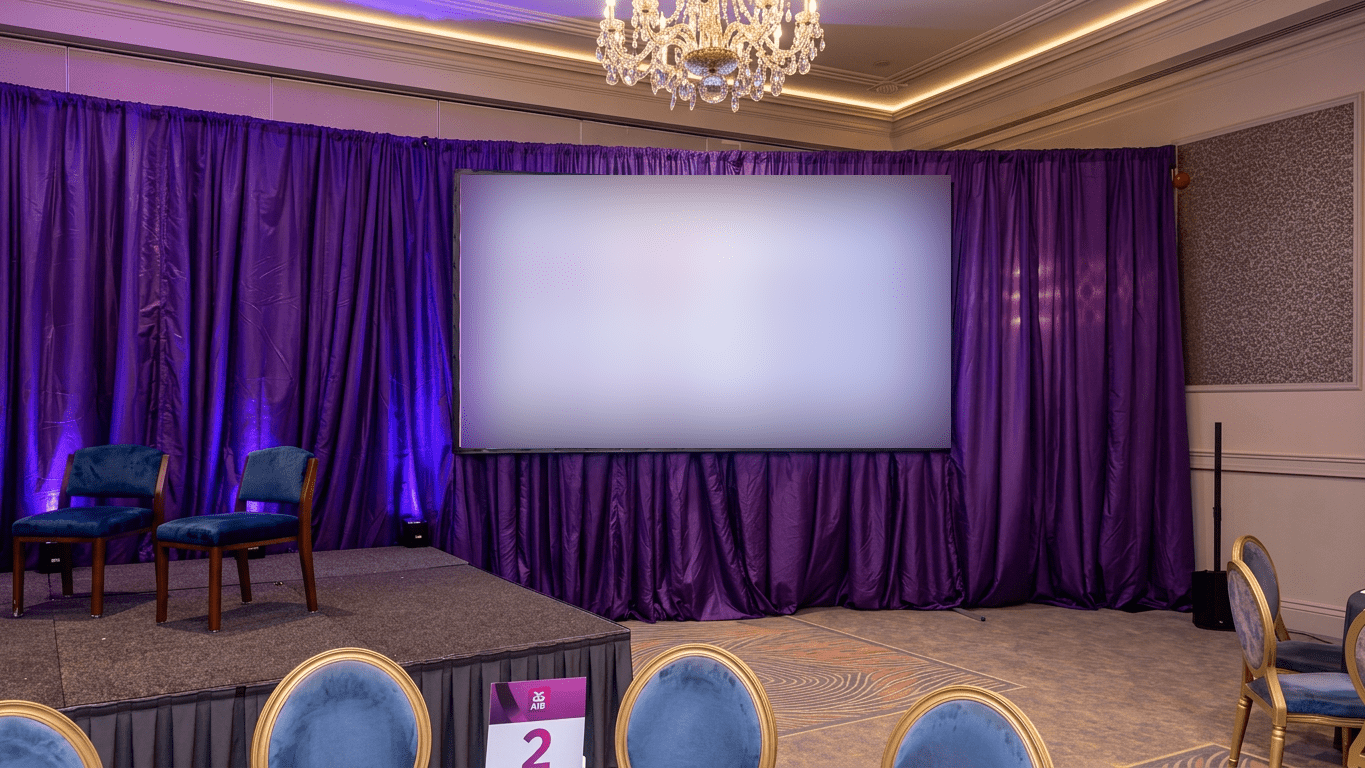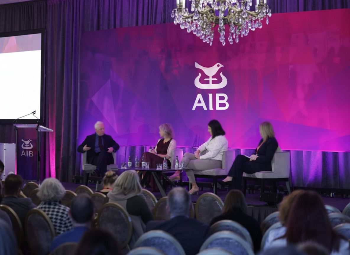 For a recent AIB conference at Killashee Hotel, Pennypop collaborated closely with the event’s AV team to elevate the visual impact of the conference space. The objective was simple: transform the room into a branded environment that reflected AIB’s identity while supporting the technical AV production already in place.
