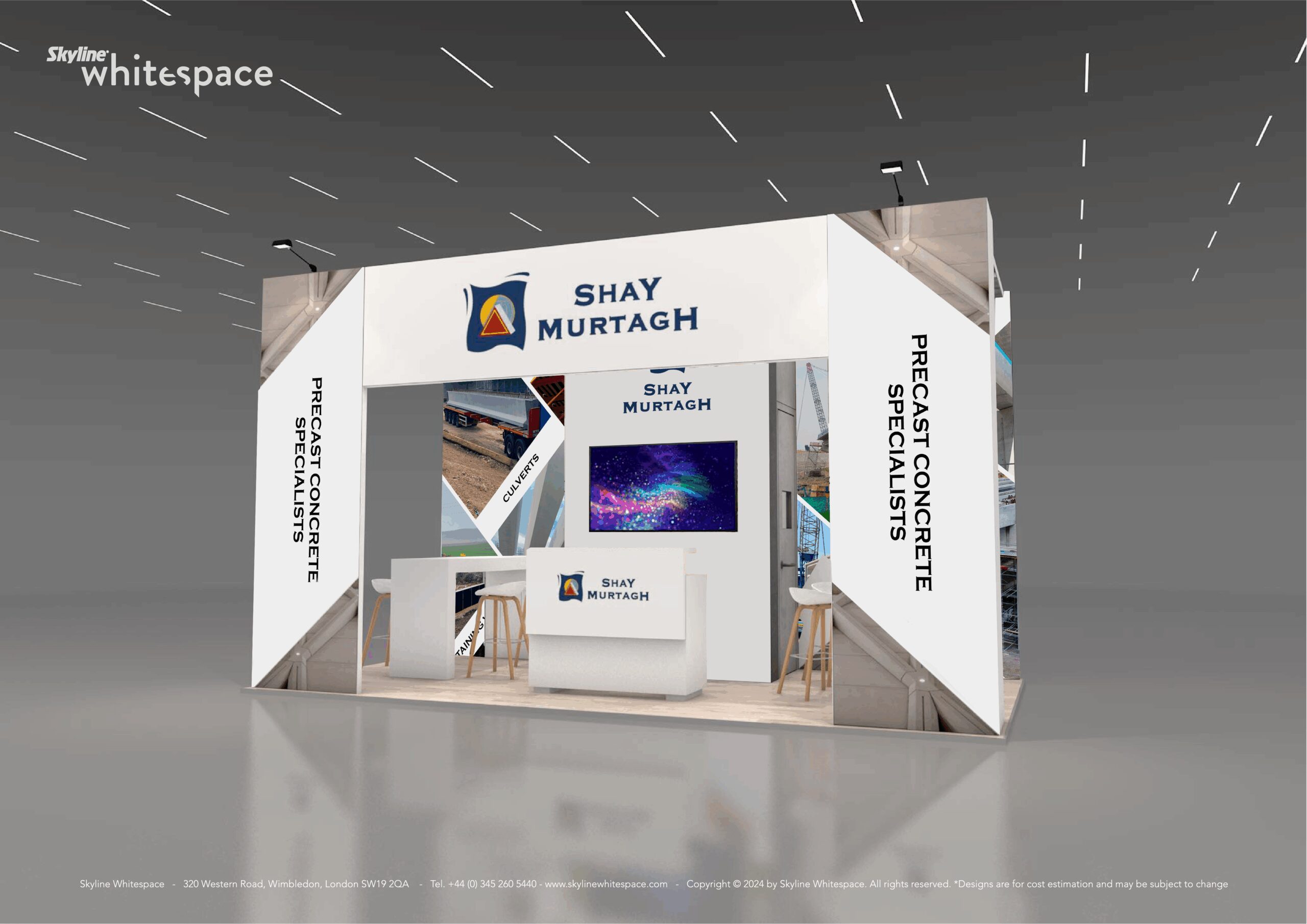 Our exhibition design team created a refreshed stand concept featuring bold branding, clean architectural lines, and immersive visual displays. Every detail was considered from initial 3D stand renders and material selections to on-site build management and installation ensuring a seamless delivery and a striking final result, complete with interactive QR codes linking directly to the Shay Murtagh website, encouraging visitor interaction and measurable digital traffic.